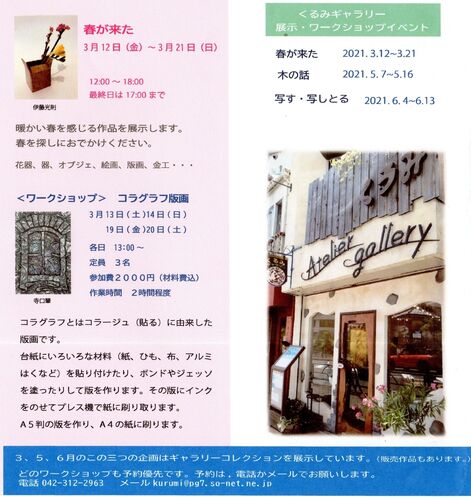 くるみギャラリーで「春が来た×コラグラフ・ワークショップ」が始まりました。 ギャラリーコレクションの作品展示とコラグラフ版画のワークショップを開催します。 暖かく柔らかい空気に似合う陶やガラスや金属のクラフト作品、絵画や版画の平面作品が並び、…