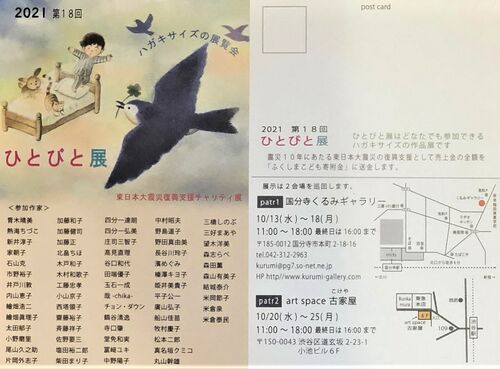 ひとびと展はどなたでも参加できるハガキサイズの作品展示です。今年は18回目になりますが、前回までは立川にあったアトリエざっくが主催していました。ざっくが閉じた後、有志で会を続けることになり、今回は66名、166枚の作品が寄せられました。絵…