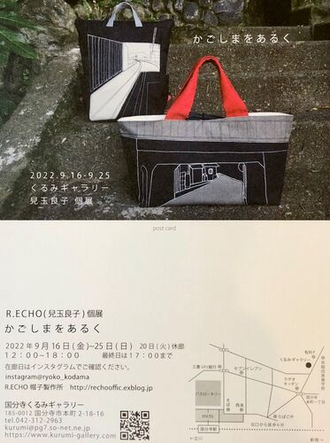 帆布のカバン、帽子を制作しているR.ECHOさんの個展です。 今回のテーマは作家の郷里である鹿児島の風景や、鹿児島の動物園にいる動物たち。 愛着のある風景や生き物たちが絵のような構図でバッグになりました。 色あいや形がおしゃれで、かぶり心地もよいベ…