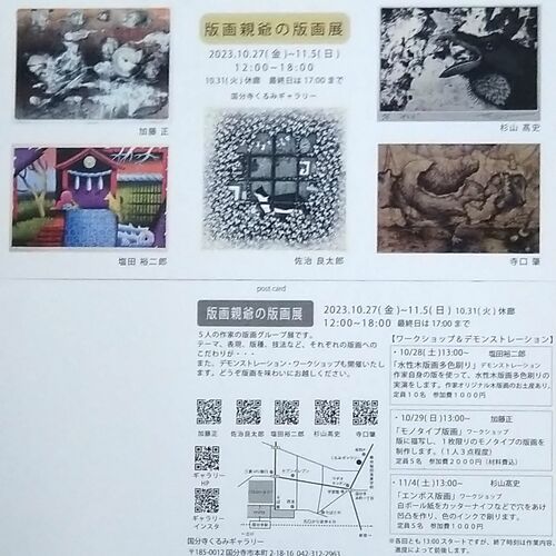 10/27㈮より5人の版画家のグループ展が始まります。「版画親爺の版画展」です。 テーマ、表現、版種、技法など、それぞれの版画へのこだわりが感じられるグループ展です。搬入後眺めていると本当にどの方も個性的です。 また、版画のワークショップも開催し…