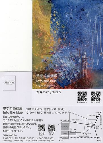 大分県竹田市で絵画、版画、陶芸作品を制作している甲斐さんの2年ぶりのくるみギャラリーでの個展です。 アクリル画も焼き物の器や陶板も、タイトルにあるように青が印象的な作品です。 壁面を飾るブルーと台面のブルーで、空間がひきしまり、静かですが豊…