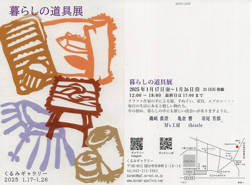 「暮らしの道具展」でくるみギャラリーの2025年の展示がスタートしました。クラフト作家の手による器、手ぬぐい、家具、エプロン・・・毎日の生活で日々使って心地よく、そばにあって嬉しい物たち。年の初め、暮らしの中にも新しい出会いがありますよう…