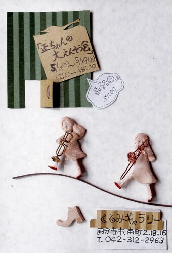 毎年5月に展示をしている斉藤さん。今回は一人の少女が様々な楽器を奏でています。正ちゃんとは誰でしょうか? 全てダンボールの額縁に、木や針金で人物や楽器が作られていますが、素材の特徴を生かして、美しく緻密に表現されています。是非近くに寄って、…