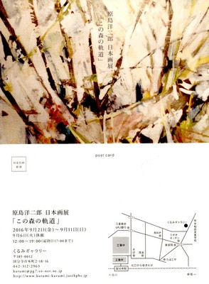 2016-09-02 原島洋二郎 日本画展「この森の軌道」 2016.9.2(金)~9.11(日) 休廊9.6(火) 未分類 原島さんは近年、身近な森に息づく草や木のイメージから、柔らかい光、白を基調に見え隠れする色、植物のフォルムが響き合う作品作りをしています。日本画の岩絵の具、金銀箔の発色が美しい作品です。今回は4号~10号の日本画12点が展示されています。 また、原島さんは制作とともに、青梅でギャラリーUORIのオーナーとしても活動しています。 夏の暑さに疲れた頃、静かな森の中でゆっくり目と心を楽しませてください。 12:00~19:00 最終日は17:00まで