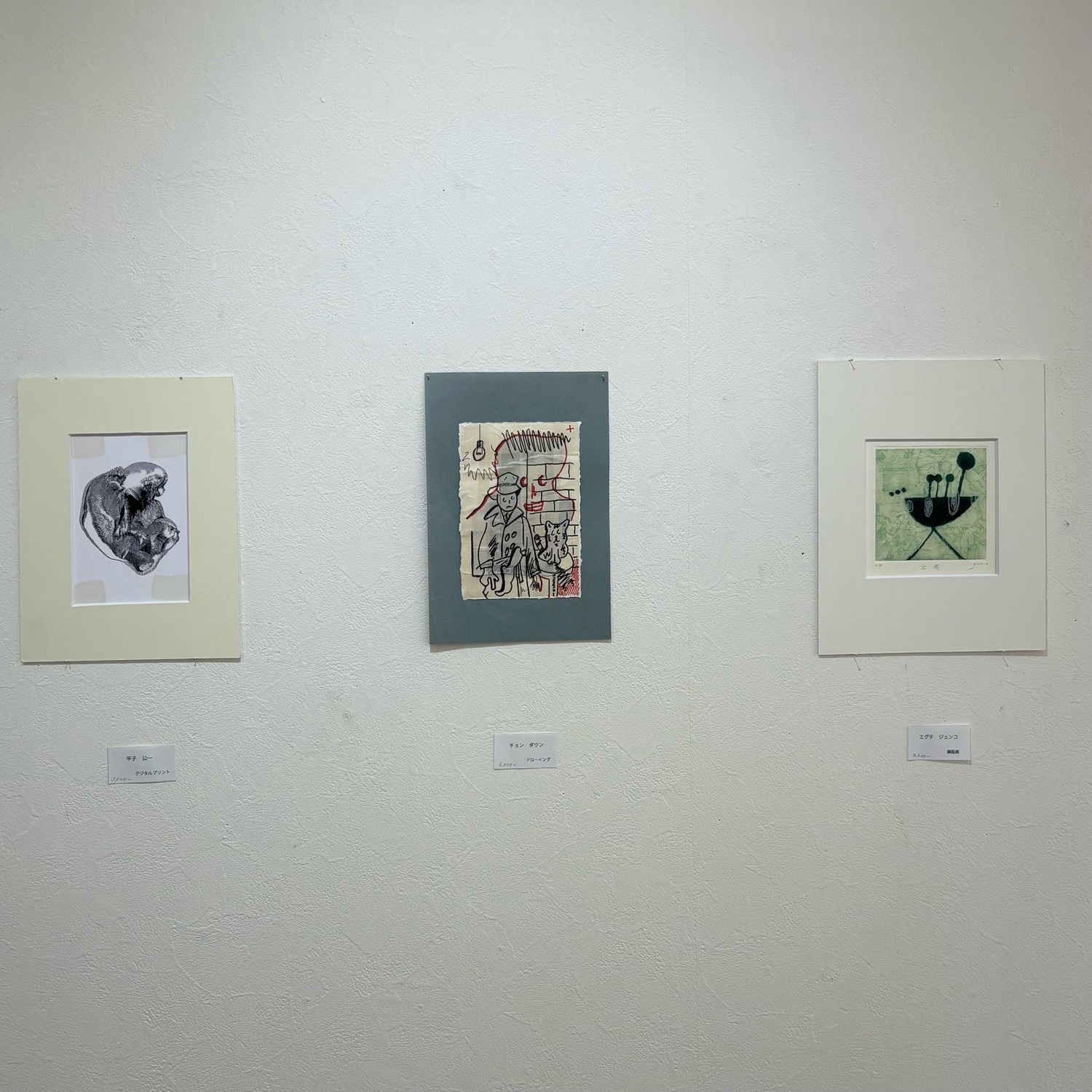 はがき大の白ボール紙に、ニードルや針などで直接繪を描いたり、紙をはがしたりして版を作ります。それにインクをつめて布でこすり、プレス機で凹版として摺ります。